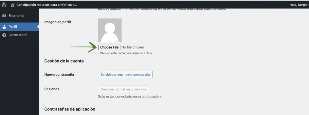 Paso 2: Navegar en esa página hacia abajo hasta donde dice «Imagen de perfil» y click en el botón «Choose file». Ahí te permitirá elegir una foto de tu computadora.